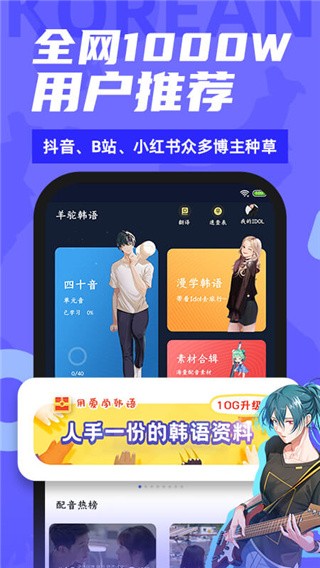追番、唱歌,韩日剧tvb、韩国明星应援打call!韩内覆盖华数TVB/TOPIK考试中各类题型一键刷题,更有《21天法医》、《太阳之夜》系列经典情景韩语等海量内容等你来看,《我们的初学者学院》《金铲屎官们的假名录》,还有各种实用韩语单词、常用短语以及日常生活用语任你挑选!